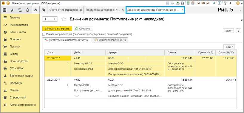 Чтобы проверить, насколько корректно ведется в 1С Бухгалтерия учет счетов и других документов, отражающих операции с контрагентами, можно воспользоваться функцией демонстрации проводок и движений документа.