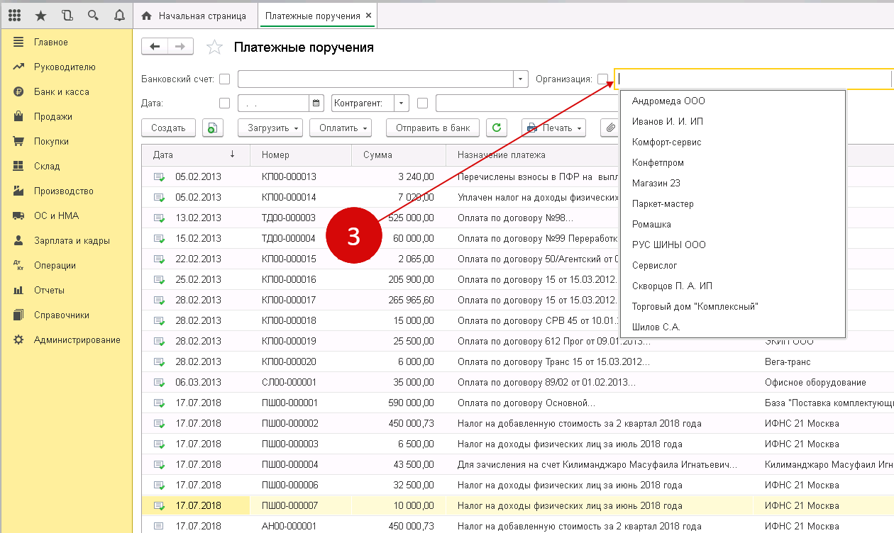 В открывшемся окне появится журнал с платежками, где можно, настроив соответствующий отбор, отфильтровать необходимые документы, например, вывести список по определенной организации, банковскому счету, дате или контрагенту.
