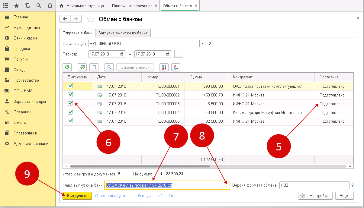 В окне вы видите платежные поручения, подготовленные для оплаты. Они находятся в состоянии «Подготовлено» (5). Платежки, которые будут выгружены, отмечены галочками (6). Вы можете снять галочки с платежных поручений, если не хотите их оплачивать. В окошке «Файл выгрузки в банк» (7) вы увидите путь к файлу, который указали в настройке обмена с клиент-банком. Вы можете указать и другой файл для выгрузки. Для этого нажмите кнопку «…» (8). Для сохранения файла с платежками нажмите кнопку «Выгрузить» (9). После этого статус платежек поменяется на «Отправлено». Ваши платежки отправлены в банк.