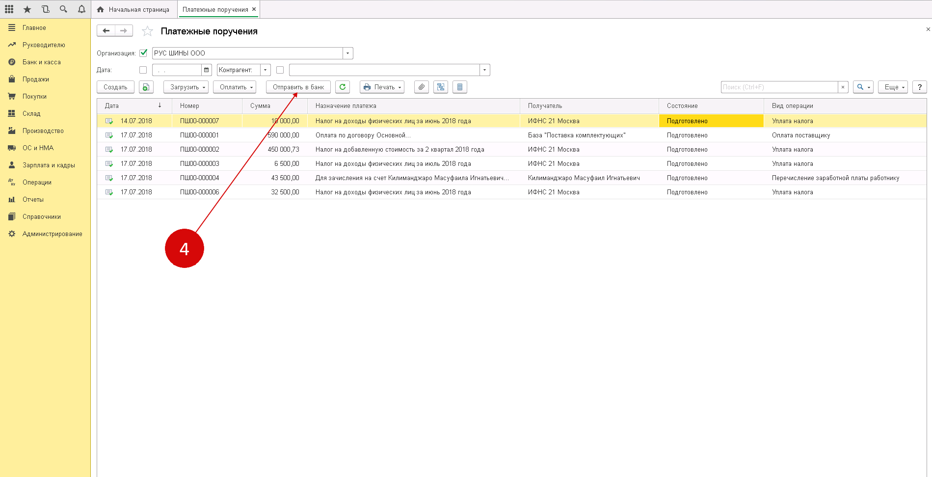 Теперь в окне вы увидите платежки только по выбранной организации. Далее нажмите кнопку «Отправить в банк» (4). Откроется окно «Обмен с банком».