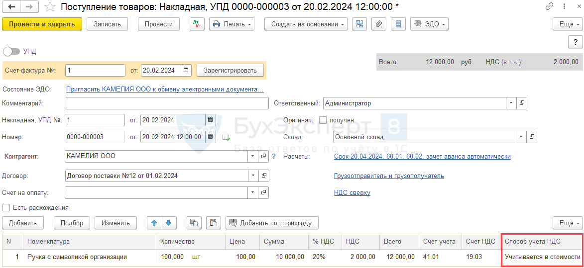 | 20 февраля | — | — | 12 000 | Регистрация СФ поставщика | Счет-фактура полученный на поступление | ||