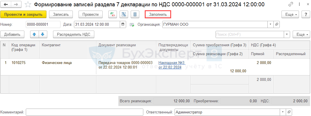 | 31 марта | — | — | 12 000 | Отражение необлагаемой операции в разделе 7 декларации по НДС | Формирование записей раздела 7 декларации по НДС |