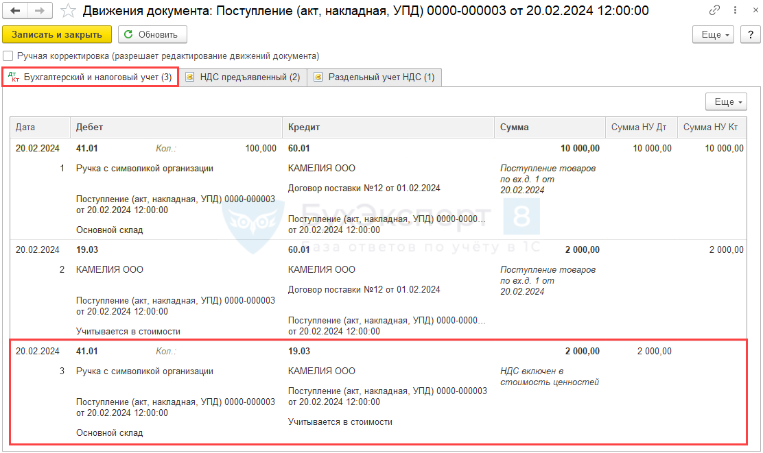 | 41.01 | 19.03 | 2 000 | 2 000 | Включение НДС в стоимость | |||