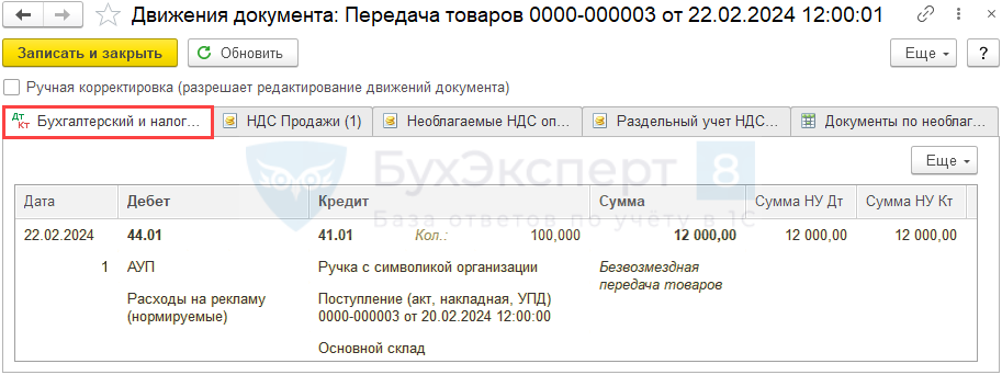 - Ручка с символикой организации: безвозмездно переданный рекламный товар, выбирается из справочника Номенклатура;