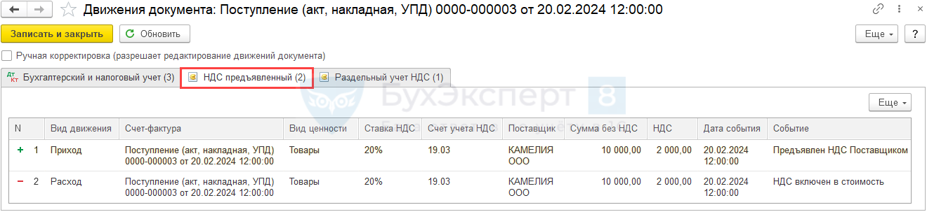 - регистрационную запись Приход по счету-фактуре на сумму предъявленного НДС;