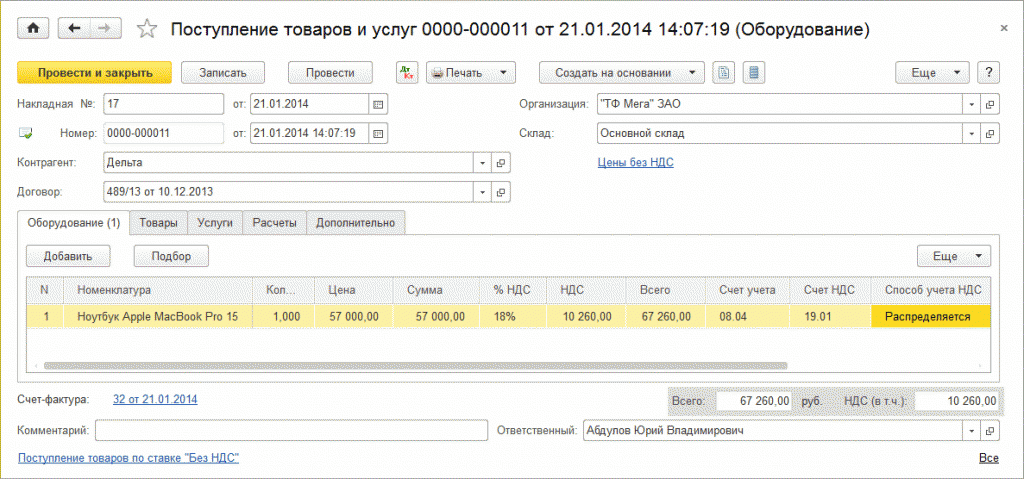 Поступление оборудования оформляется документом «Поступление товаров и услуг» (меню «Покупка» — «Поступление товаров и услуг») с видом операции «оборудование».