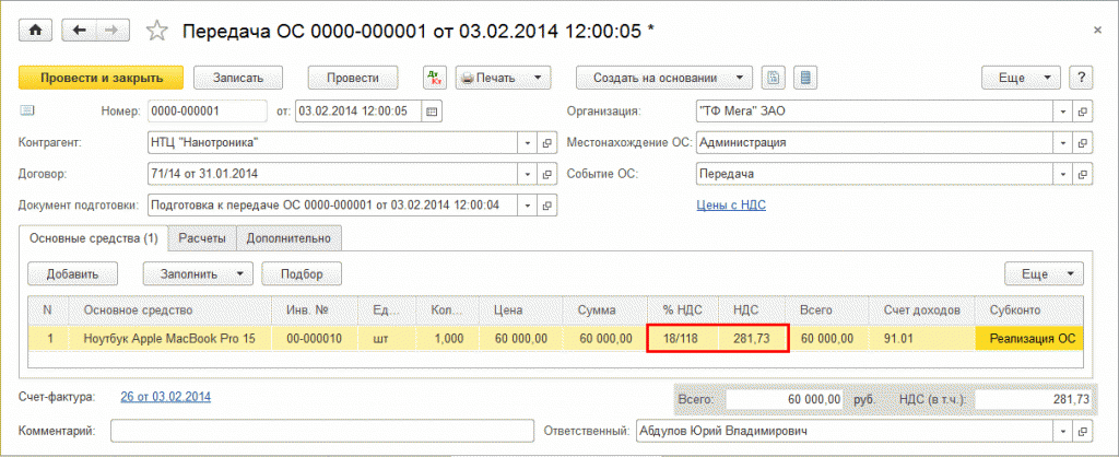 Рис. 7. Оформление передачи ОС, подлежащего учету по стоимости с НДС