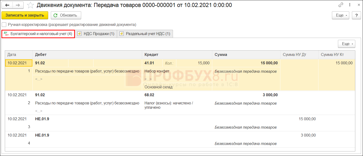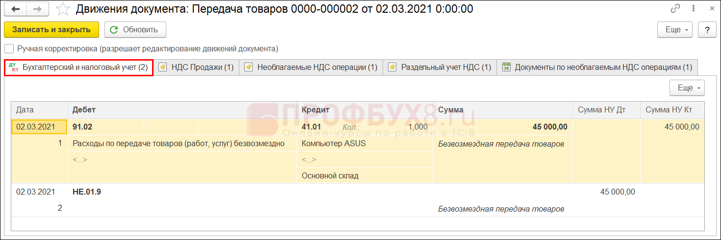 Мы с вами рассмотрели, как отражается безвозмездная передача товара в 1С 8.3.