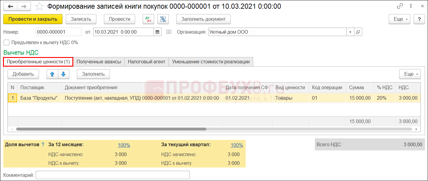 Всего приобрели 15 наборов конфет на сумму 18 000 руб., в т. ч. НДС 3 000 руб. НДС берем к вычету, поэтому в поле Способ учета НДС выбираем вариант Принимается к вычету.