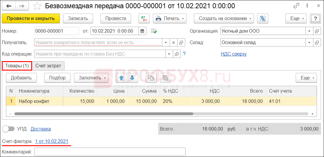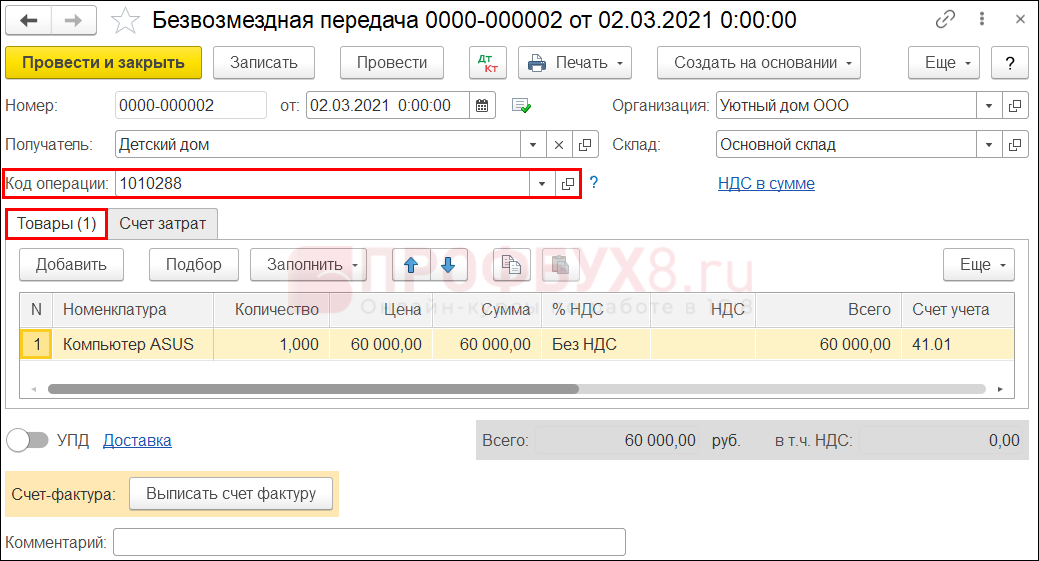 Сохраните документ и создайте счет-фактуру по кнопке Выписать счет-фактуру. Так как передача безвозмездная, код вида операции будет — 10 «Безвозмездная передача товаров, работ, услуг».