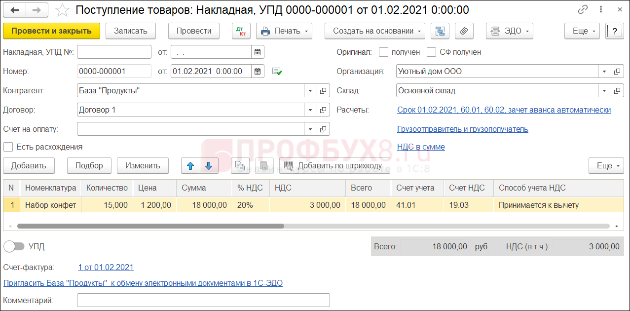 Покупку конфет отразите типовым документом Поступление (акт, накладная) в меню Покупки – Поступление (акты, накладные, УПД).
