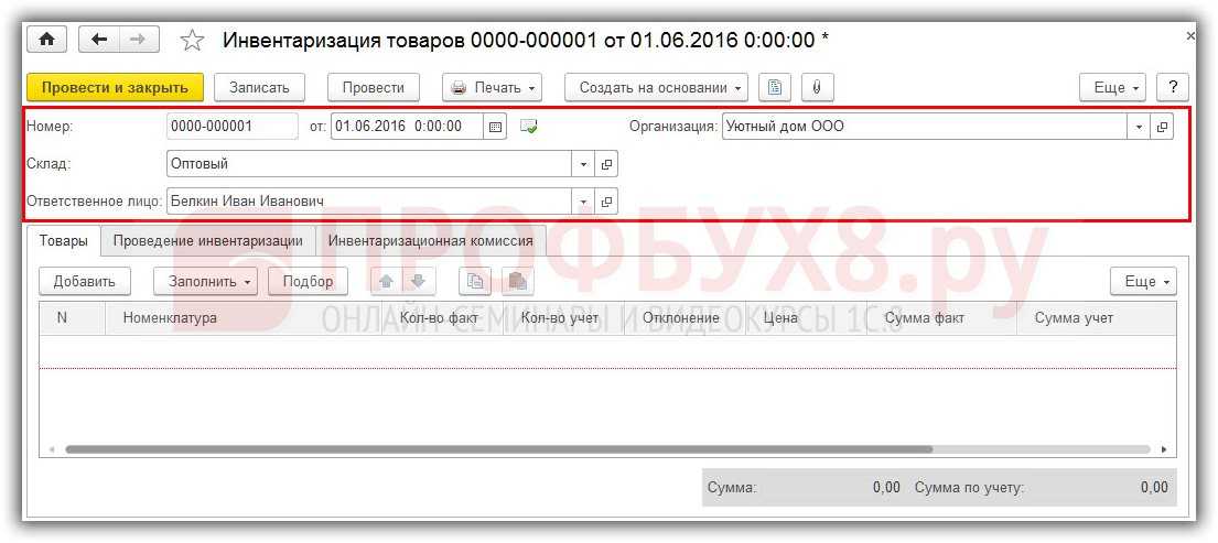 Создадим новый документ инвентаризации. Прежде всего в документе указывается склад, на котором проводится инвентаризация, и организация, которой принадлежат товары: