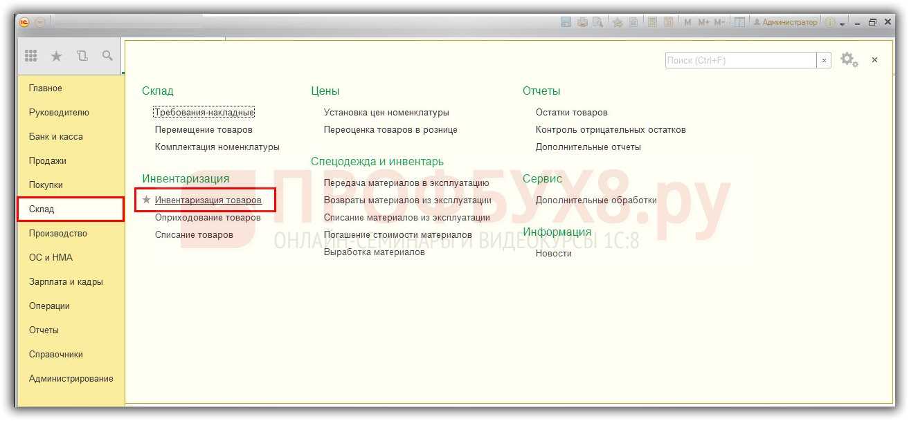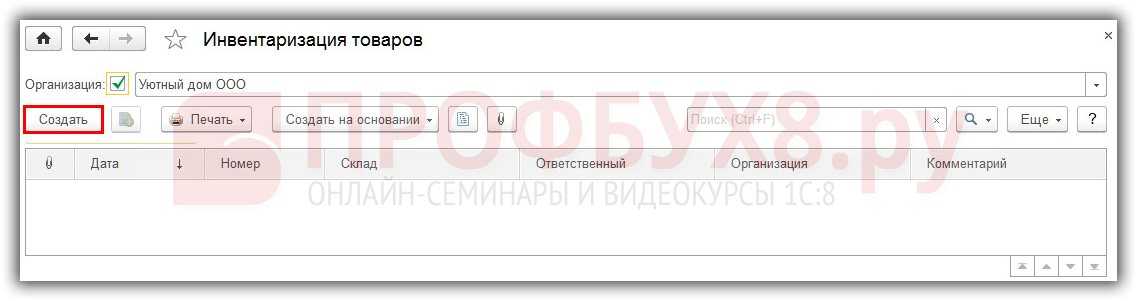 Документ Инвентаризация товаров создается через раздел Склад – Инвентаризация – Инвентаризация товаров: