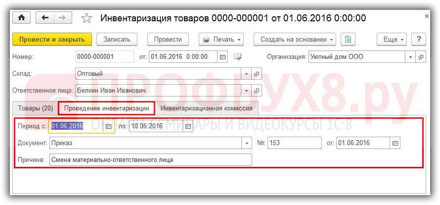 - поле Документ – реквизиты документа-основания проведения инвентаризации;
