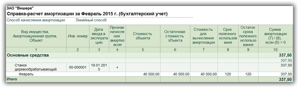 Справка-расчет амортизации помогает увидеть список ОС, на которые зачисляется амортизация. Тут будут отображены дата занесения ОС, стоимость и остаточная стоимость (первоначальная стоимость за вычетом амортизации) объекта, срок погашения, остаток срока и собственно сумма амортизирования.