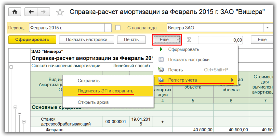 Расчет амортизации через регламентную операцию производится каждый месяц. После расчета можно открыть и распечатать соответствующую справку.