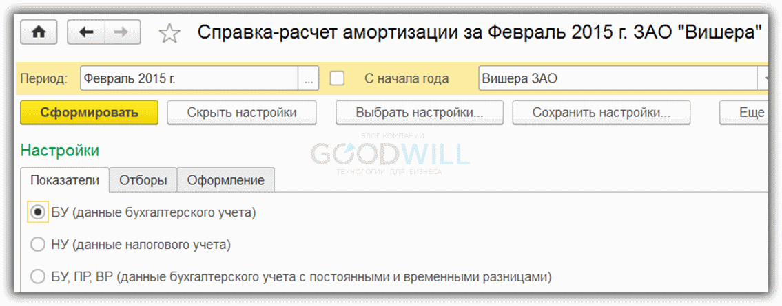 По умолчанию установлен показатель БУ, то есть отчет формируется по данным бухгалтерского учета. При необходимости можно установить показатель и сформировать отчет по данным налогового учета (НУ) либо по данным бухгалтерского учета с постоянными и временными разницами (БУ, ПР, ВР).
