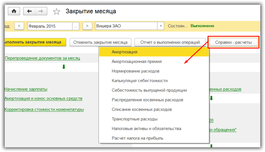 В форме закрытия месяца следует нажать на ссылку конкретной операции и выбрать в выпадающем меню справку-расчет (они имеют пиктограмму «отчет»). При этом месяц должен быть закрыт.