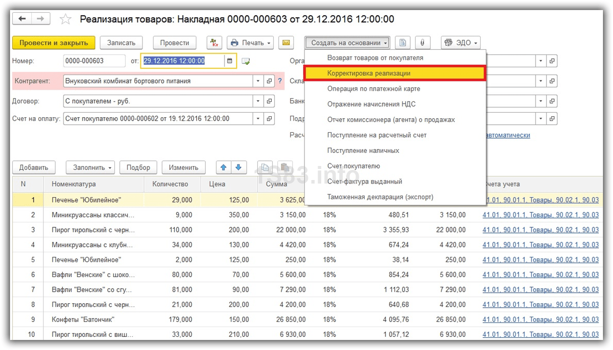 Откроем любой документ реализации из демо-базы и создадим на его основании документ «Корректировка реализации».