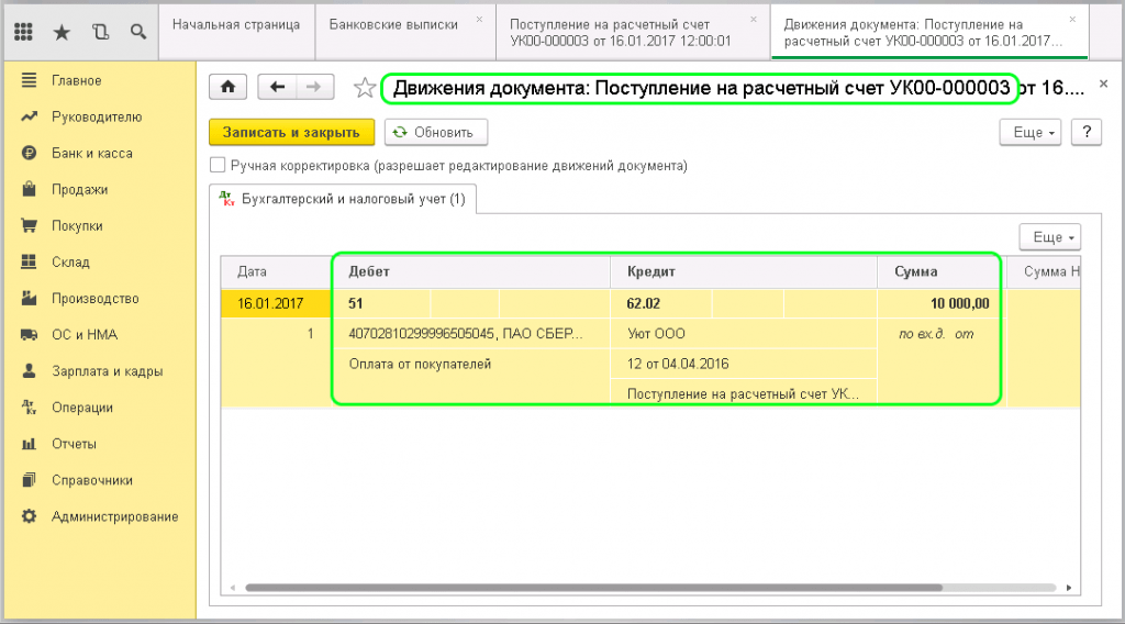 И еще один вариант рассмотрим, когда поступила оплата от клиента, ее провели в 1С через документ «Поступление на расчетный счет» и в этот же день происходит отгрузка. Казалось бы, что никакого аванса быть не должно, но если посмотреть внимательно, то поступление денег оформлено раньше по времени, чем создана реализация. Проверим проводки и увидим, что программа также размещает данную сумму на счет 62.02: Дт51 — Кт62.02 «Расчеты по авансам полученным». И по реализации так же: