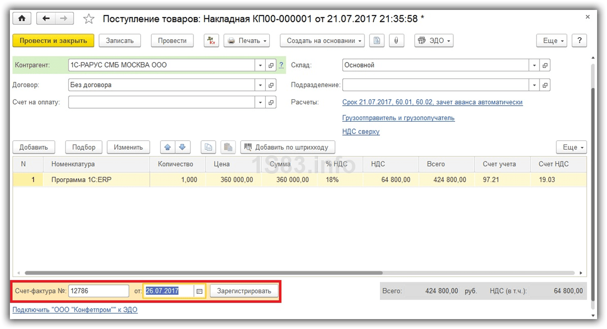 Если поставщик выставил счет-фактуру, то его необходимо зарегистрировать в программе.