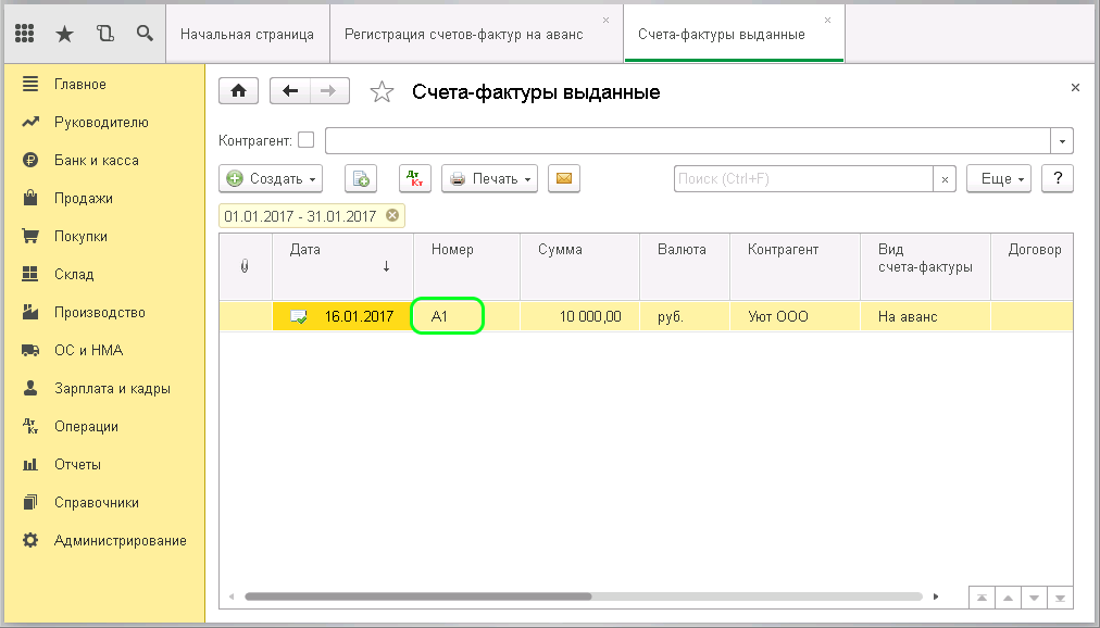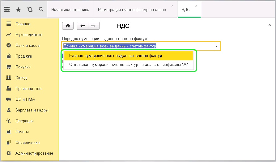 Отдельная нумерация счетов-фактур на аванс с префиксом А.