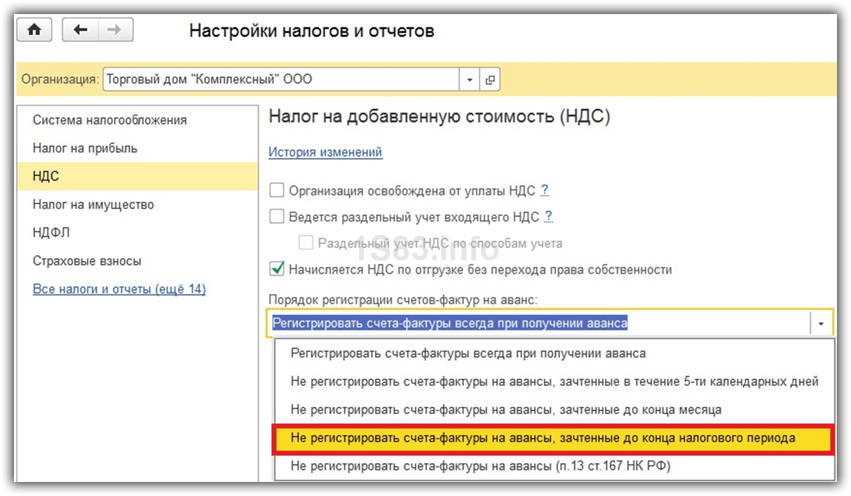 В учетной политике вашей организации перейдите к настройке налогов и отчетов. В разделе «НДС» нам будет необходимо изменить «Порядок регистрации счетов-фактур на аванс».