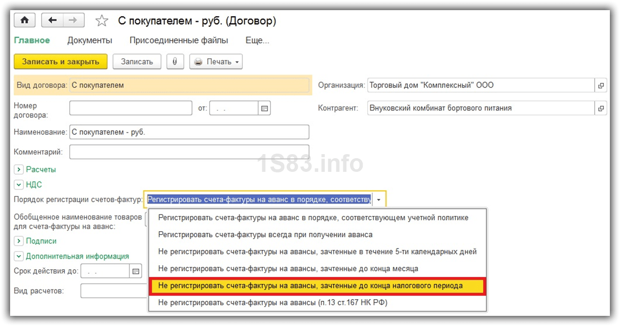В рамках нашего примера мы выберем из выпадающего списка пункт «Не регистрировать счета-фактур на авансы, зачтенные до конца налогового периода».