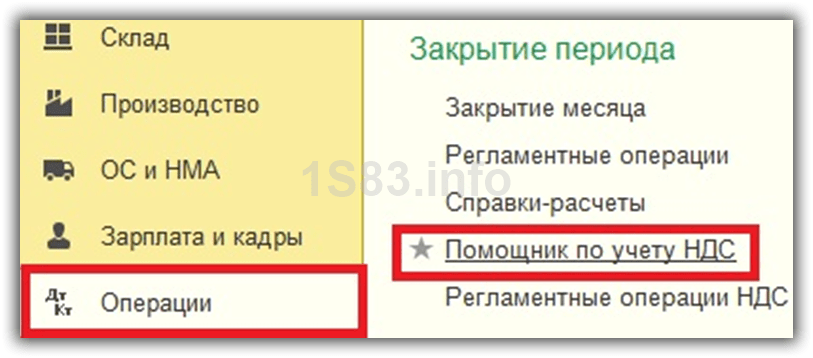Сам процесс выставления счетов-фактур на аванс осуществляется при помощи помощника по учету НДС. Он расположен в меню «Операции».