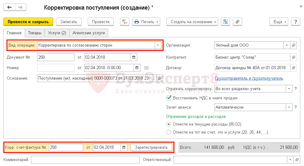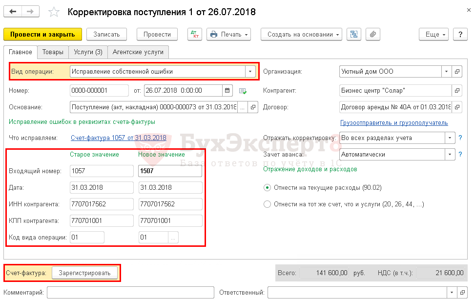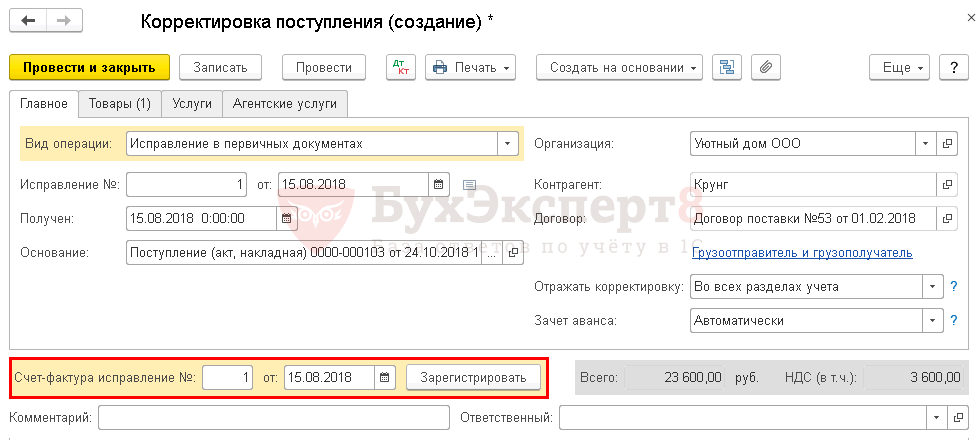 Зарегистрировать корректировочный или исправительный счет-фактуру от поставщика в 1С сможете в документе Корректировка поступления :