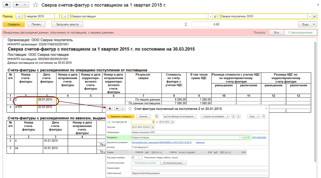 Формируется печатная форма сверки счетов-фактур по данным поставщика и покупателя. Результаты сверки счетов-фактур по операциям поступления от поставщика и счетов-фактур по авансам, выданным поставщику, выводятся в отчет разделами.