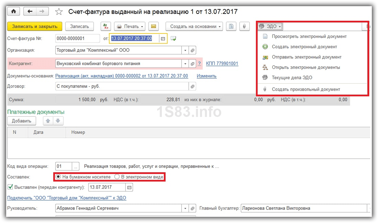 В получившемся счете-фактур вы можете указать способ доставки: на бумажном носителе, либо в электронном виде. Второй способ обычно применим в тех случаях, когда ваша организация и контрагент подключены к системе электронного документооборота. В такой ситуации отправка и прием документов может осуществляться непосредственно в 1С.