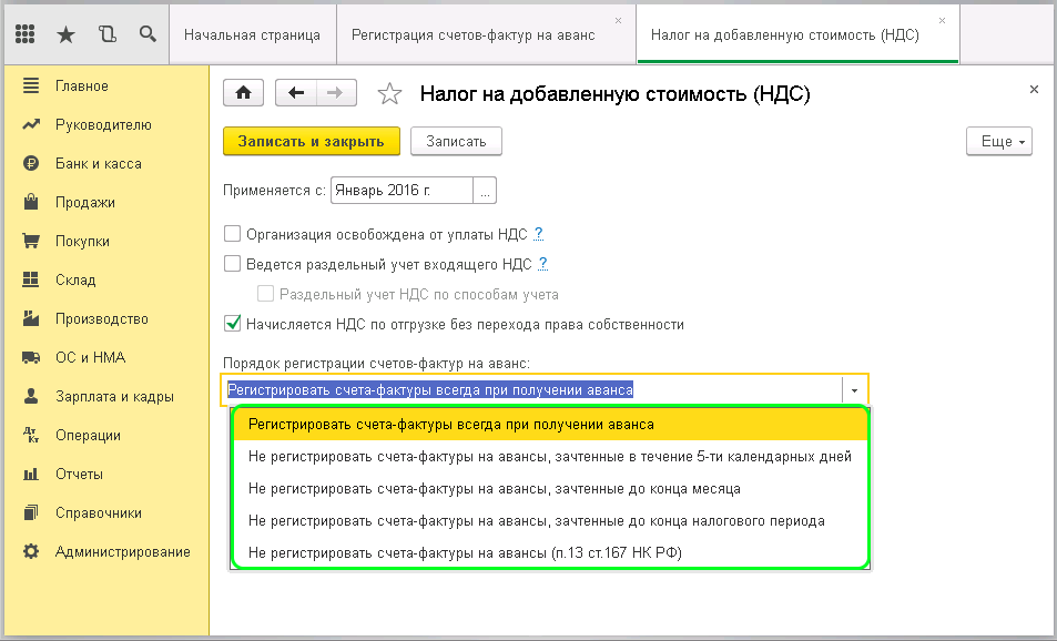 По умолчанию установлен первый вариант. Это означает, что на все полученные авансы будет выписан счет-фактура.