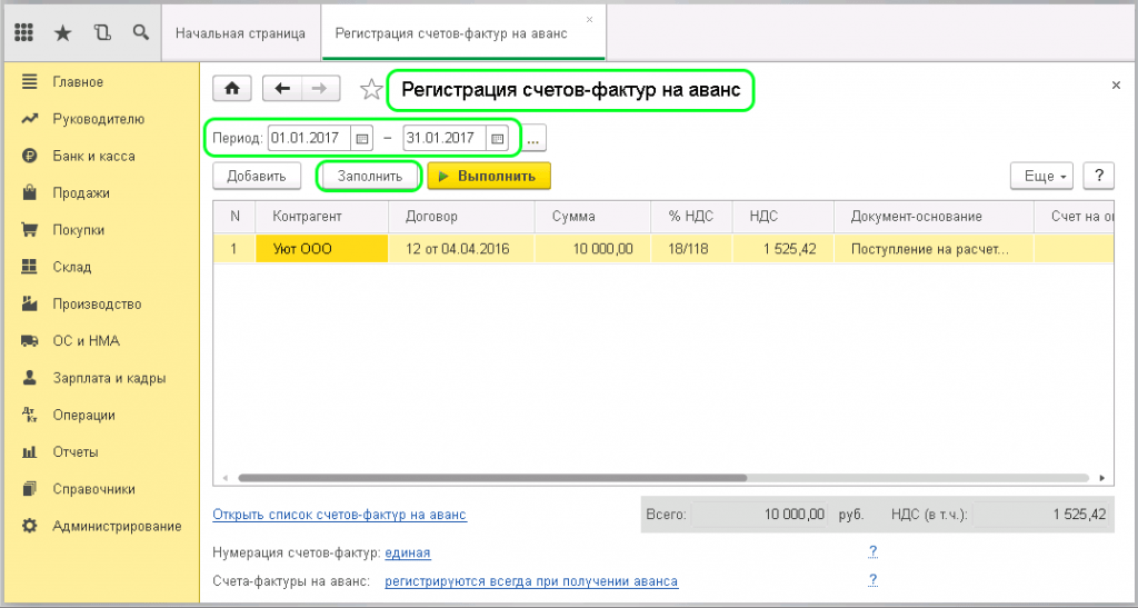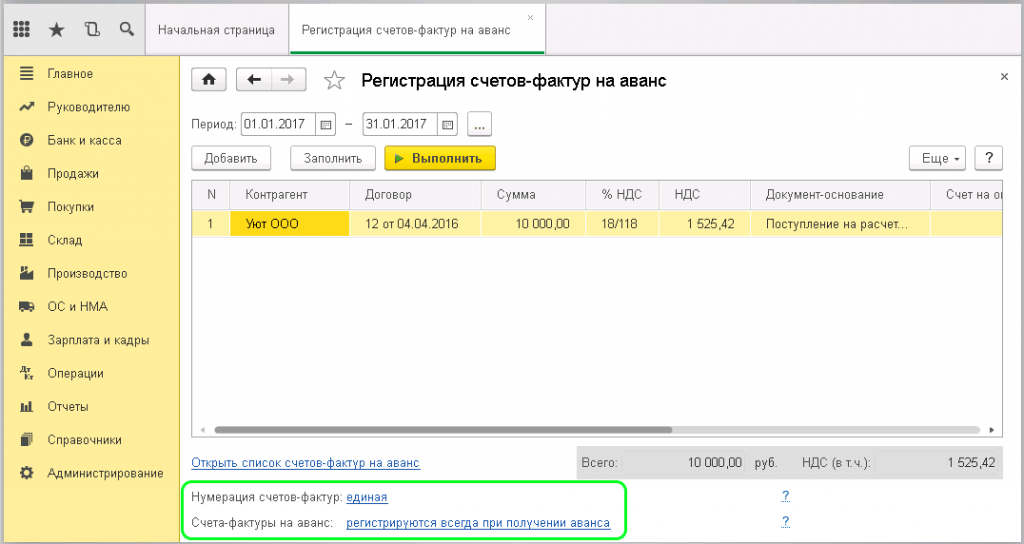 Прежде, чем приступить к созданию счетов-фактур на аванс, нужно совершить некоторые предварительные настройки.