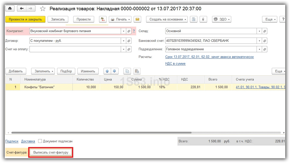 В качестве примера откроем любой документ реализации из демо-базы. В самом низу формы вы увидите кнопку «Выписать счет-фактуру».