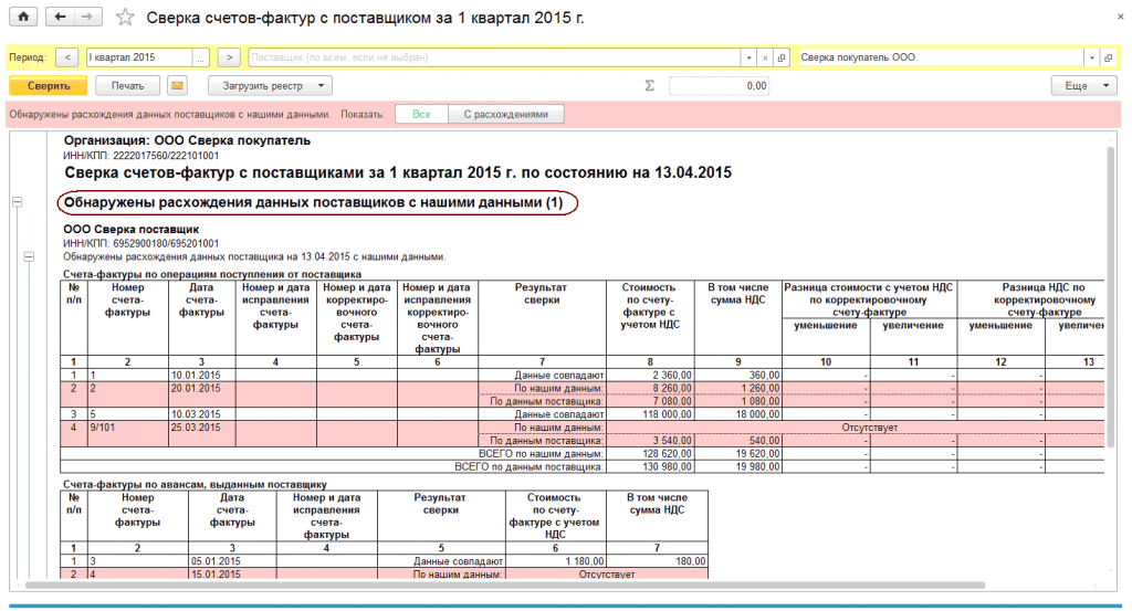 Если счет-фактура отсутствует по данным контрагента или по данным предприятия, а также присутствует отличие в суммах, то это считаются расхождениями. Строки с расхождениями показываются в отчете дважды – «по нашим данным» и «по данным поставщики» и выделяются красным цветом. Можно сделать так, чтобы отображались только данные с расхождениями.