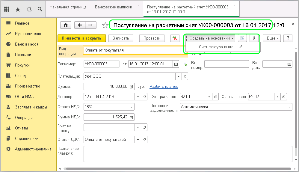 Перейдем к основному вопросу: как оформить счет-фактуру на аванс в 1С 8.3. Имеется два способа: автоматический и ручной. Ручной режим подразумевает создание документа «Счета-фактуры на аванс» прямо из документа «Поступление на расчетный счет». Делается это через клавишу «Создать на основании», выбрать «Счет-фактура выданный». Откроется сформированный документ. Можно проверить заполнение и провести.