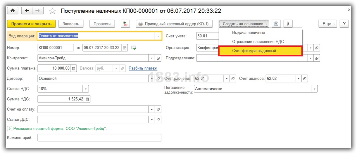 Такой вид счетов-фактур можно создавать документов по поступлению ДС, как на банковский счет компании, так и в кассу. В данном случае мы создаем на основании поступления наличных.