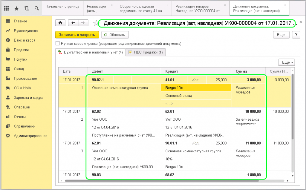А теперь рассмотрим вариант, если контрагенту был отгружен товар на большую сумму, чем внесенный авансовый платеж. Сформируются проводки с разбиением на оплату отгрузки и задолженность: