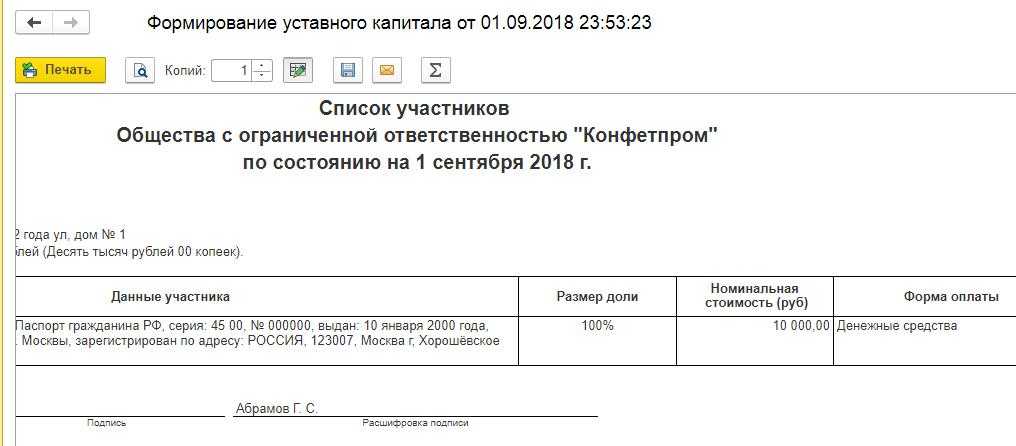 Для просмотра печатной формы документа нажимаем кнопку Список учредителей. Печатная форма имеет вид: