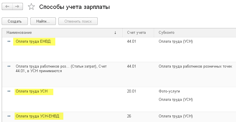 Первое, что нужно сделать — правильно настроить статьи затрат по заработной плате. Отдельно для УСН и ЕНВД.
