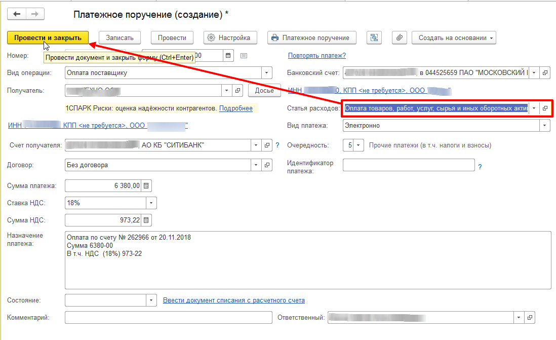 Перед нами открывается форма документа «платежное поручение», где практически все необходимые поля уже заполнены, нам лишь необходимо заполнить статью расходов и провести документ