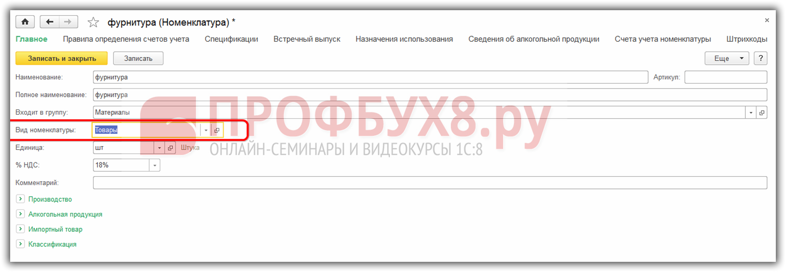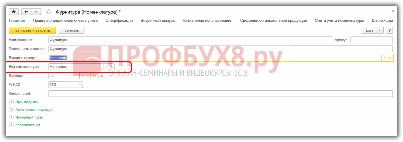 Создадим новый элемент Фурнитура (материал) в справочнике Номенклатура: