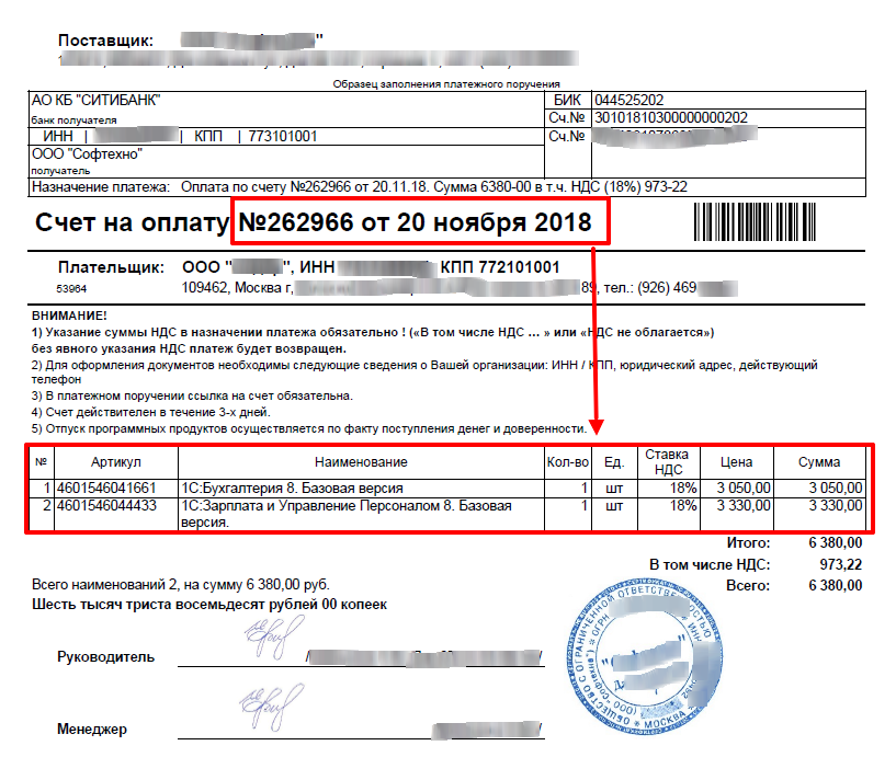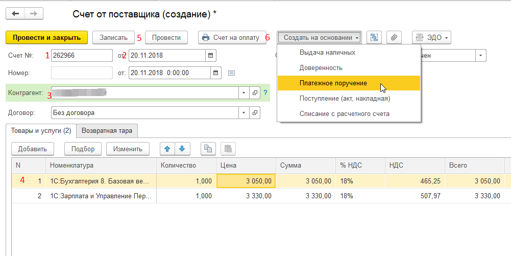 Представим ситуацию: наш поставщик присылает нам счет на покупку программных продуктов «1С» и нам нужно его оплатить