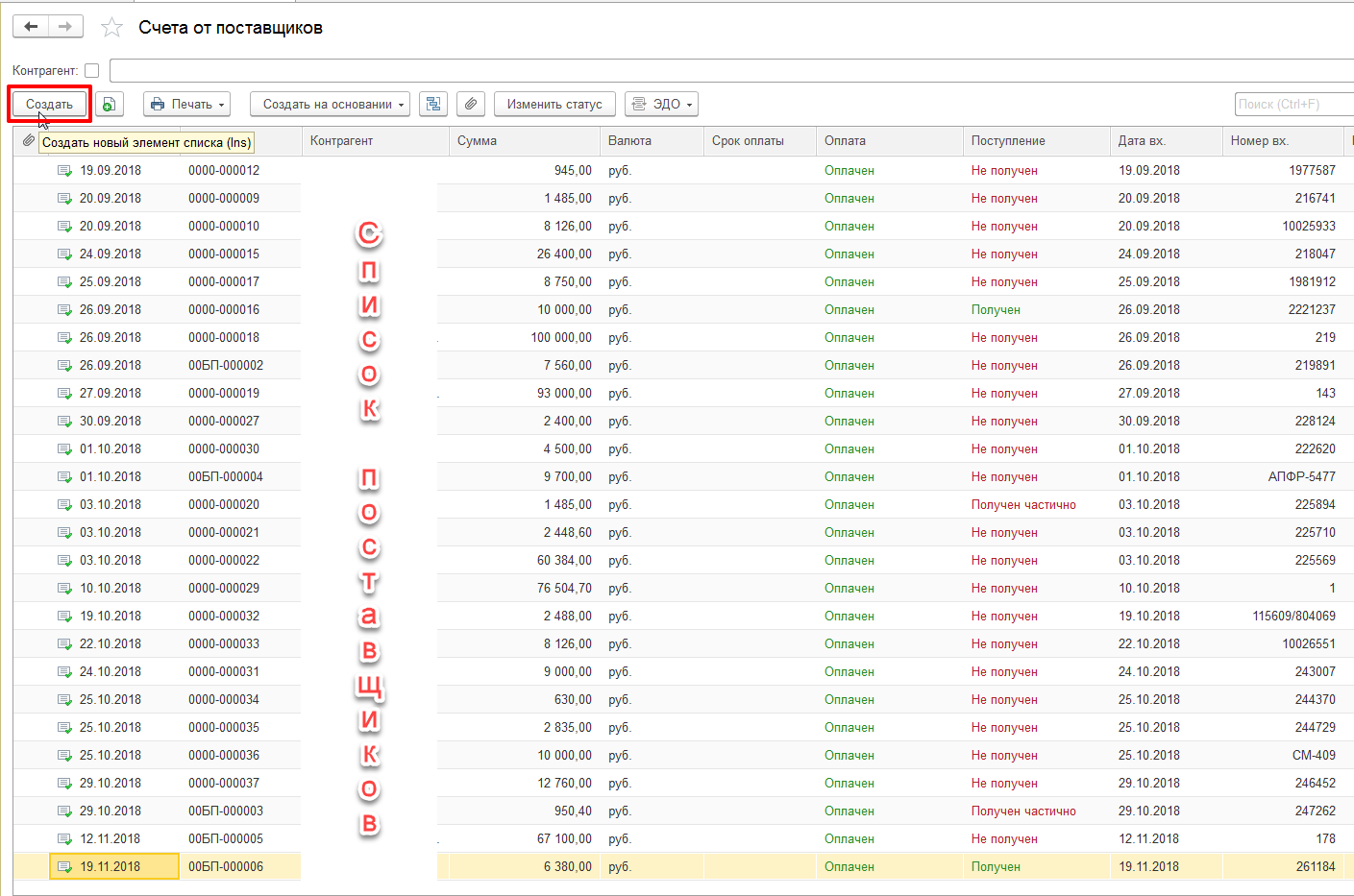 Попадаем в журнал счетов от поставщиков и жмем кнопку «Создать»