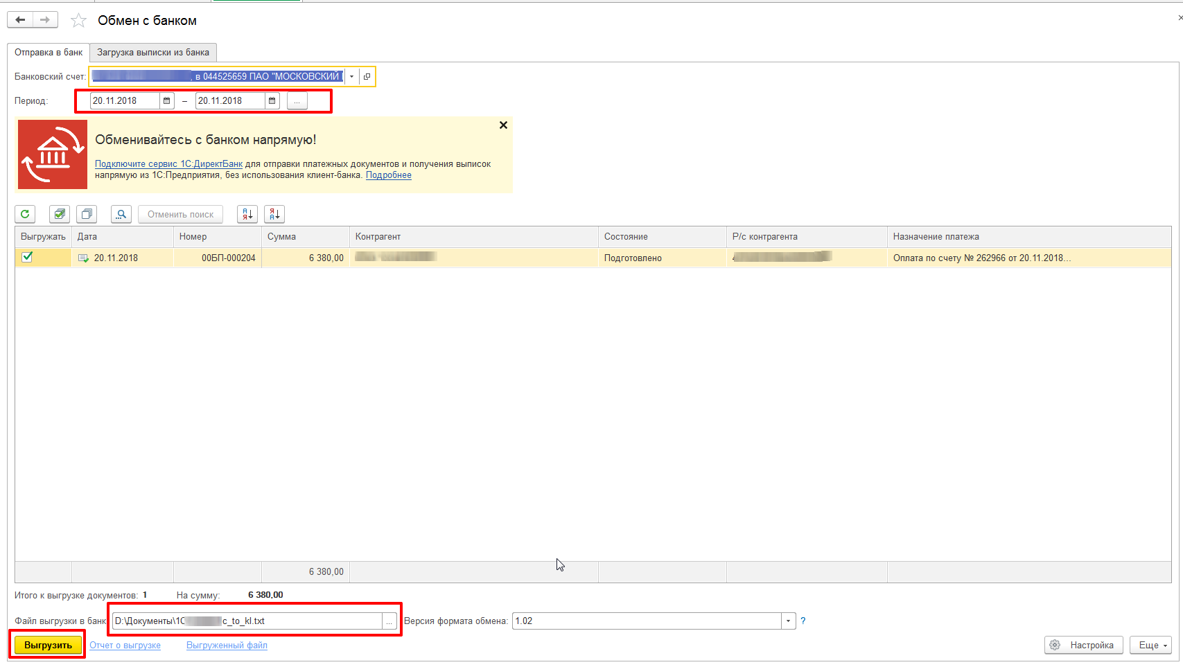 Открывается обработка «Обмен с банком», в которой на вкладке «Отправка в банк» мы выбираем банковский счет(в случае если их несколько, если счет один то он подставиться автоматически), указываем период и в низу в табличной части появляется наше платежное поручение, выделяем его галочкой, в поле «файл выгрузки в банк» выбираем путь куда будет выгружен файл обмена с клиент-банком и жмем выгрузить