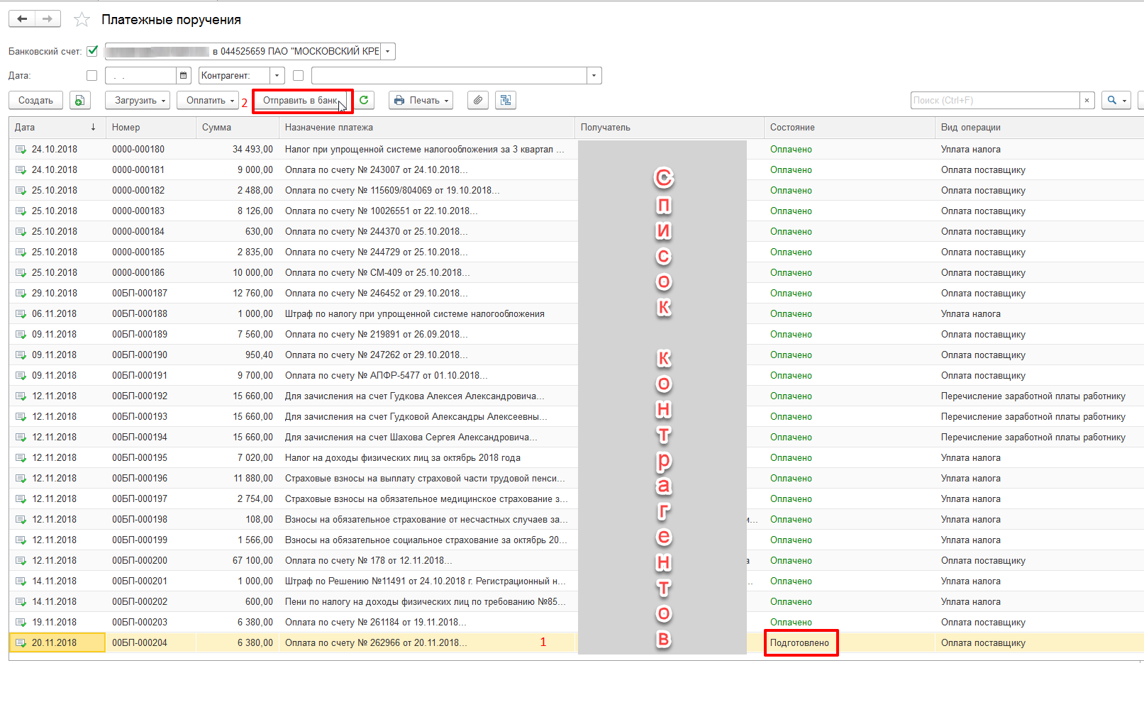 В конце списка видим наше платежное поручение, оно будет в состоянии «Подготовлено» и жмем отправить в банк