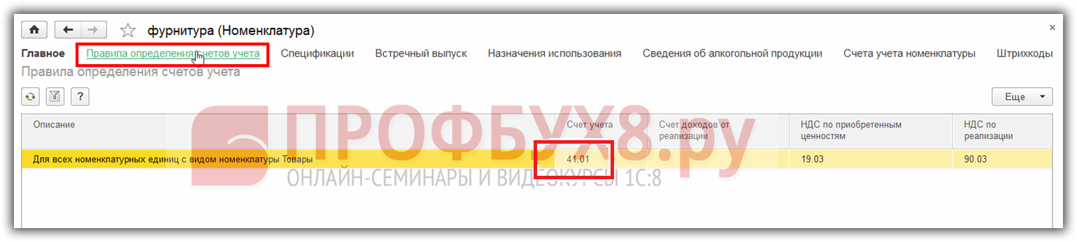 Посмотрим Правила определения счетов учета в 1С 8.3. Теперь основным счетом учета стал счет 41 «Товары». Таким образом, при создании нового элемента в справочнике Номенклатура определяющим является признак Вид номенклатуры: