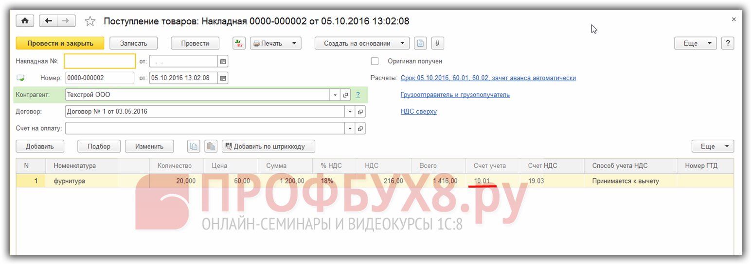 В документе видно, что счет учета по умолчанию стал 41.01, но его можно поменять, если требуется оприходовать номенклатуру на другой счет.