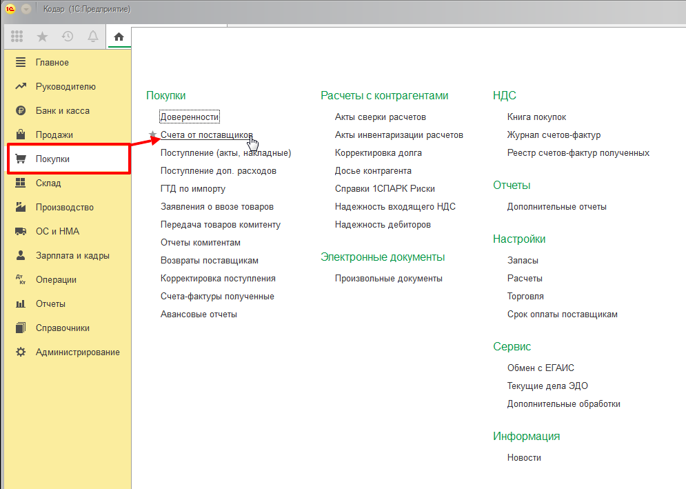 Первое что нужно сделать, это зарегистрировать этот счет в программе, для этого переходим в меню покупки и выбираем «Счета от поставщиков»